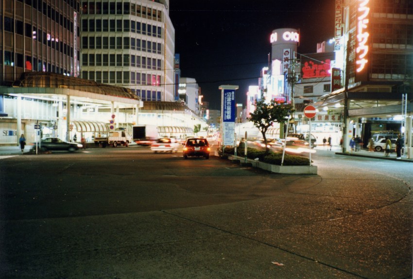 1990年頃の沼津駅前。西武沼津店本館は現在とは違い茶系の外装。右側のタカラビルにもニュースなどを流す縦型の大型電光掲示板がある。その後、西武沼津店本館は白色に塗装されタカラビルからは大型電光掲示板が無くなった。現在は20階建の大手町再開発ビルが建設中。